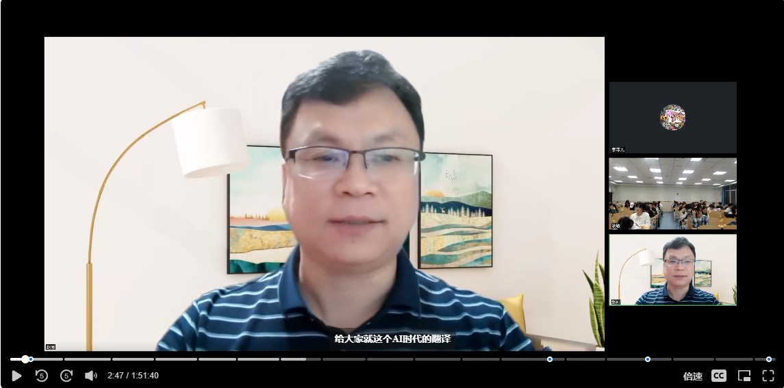赵刚教授首先系统介绍了人工智能在翻译领域的发展阶段和应用现状,客观分析了AI翻译工具给传统翻译行业带来的压力和挑战,提出在AI时代大学应培养什么样的翻译人才这一引人深思的问题。同时结合实例及自身翻译经验,他明确指出了机器翻译目前存在的不足,强调人工翻译的优势和必要性。随后赵教授从国家需求角度出发,阐明了翻译在提升国家软实力,保障国家安全等方面发挥的作用,明确了高端翻译人才培养的重要性,回答了AI时代下国家对翻译人才的要求。在此基础上,探讨了未来高端译者需要具备的八大意识,注重对译者五种翻译能力的培养和提升。