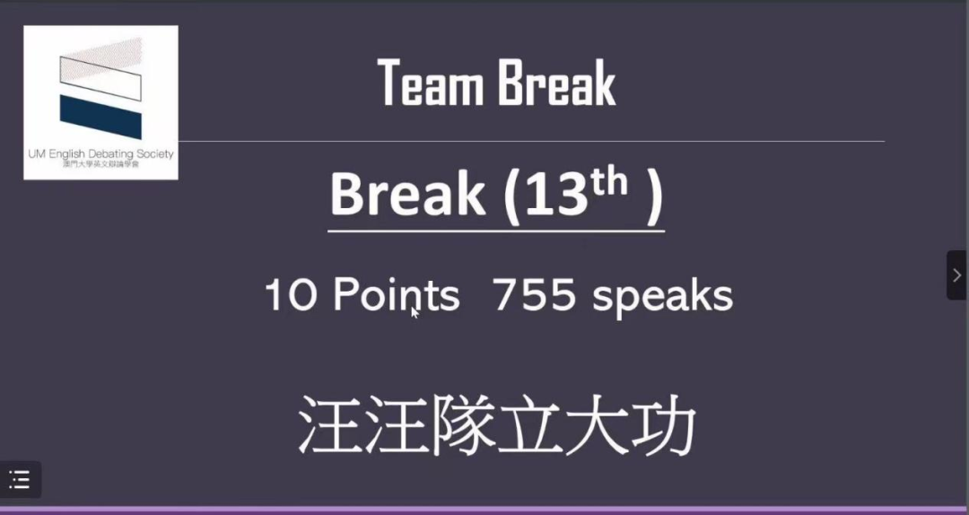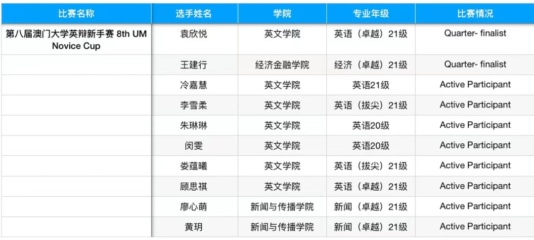 在Fourth Stop→第八届澳门大学英辩新手赛8th UM Novice Cup,王建行和队友组成的“汪汪队立大功队”,在强手如林的竞争中,他顶住压力,在前五轮积分赛中获得10分总分,成功晋级四分之一决赛,本次参赛院校有香港大学、澳门大学、中国政法大学、北外、上外、广外、上交大、四川大学等学校,共64支队伍。